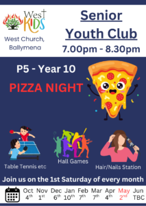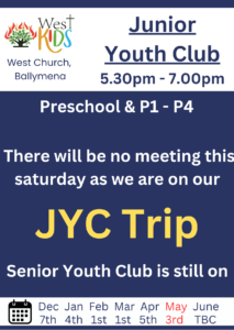 JUNIOR YOUTH & SENIOR YOUTH CLUB – Saturday 2nd May in the Main Hall. JYC Trip Saturday & SYC 7.00 pm to 8.30 pm.
