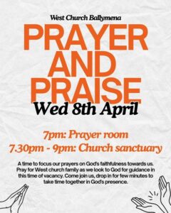 WEDNESDAY 8th April – 7.00 pm in the Prayer Room & 7.30 pm to 9 pm in the Church Sanctuary.